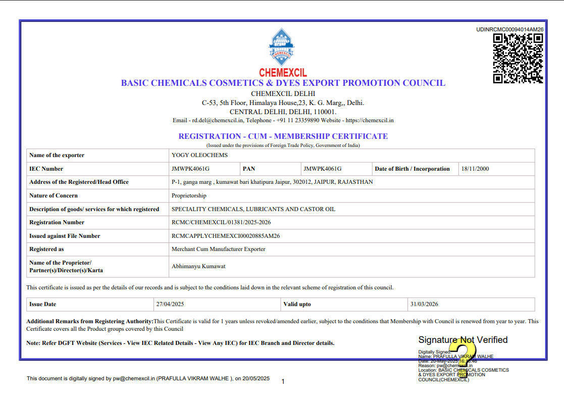 Our Registration-Cum-Membership Certificate (RCMC) officially recognizes us as a Manufacturer Exporter of specialty chemicals, lubricants, and castor oil, reinforcing our credibility as a trusted global supplier