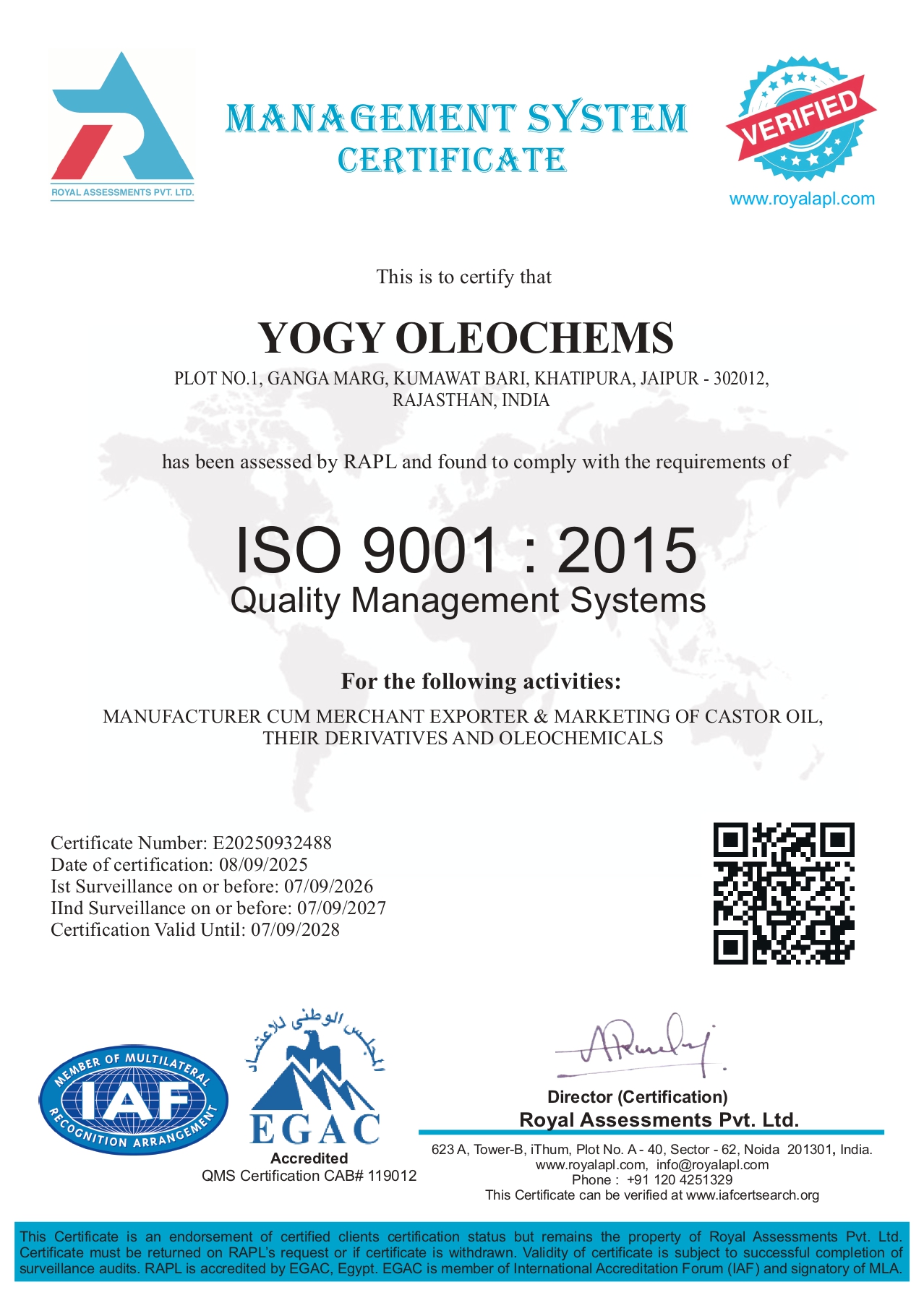 At Yogy Oleochems, quality is more than a promise — it is the foundation of everything we do. Our ISO 9001:2015 certification demonstrates our ability to consistently deliver products and services that meet international standards, regulatory requirements, and customer expectations.